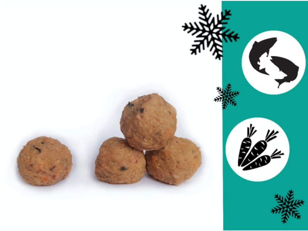 Balení obsahuje: losos svalovina, kapr celý bez vnitřností, sezónní zelenina, ovesné vločky, s kostí